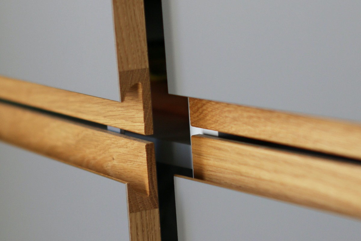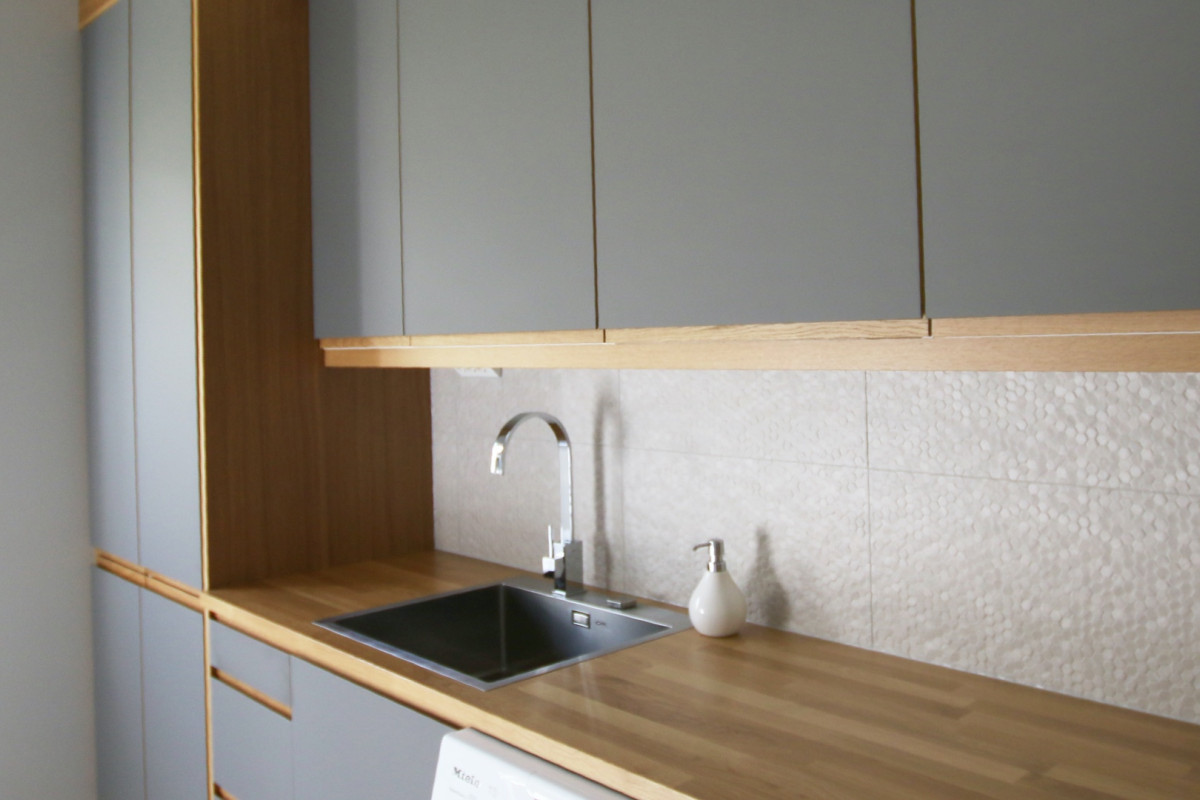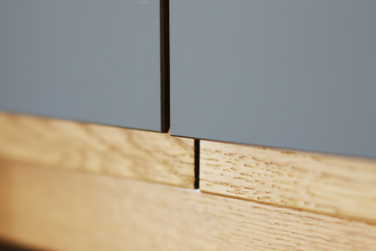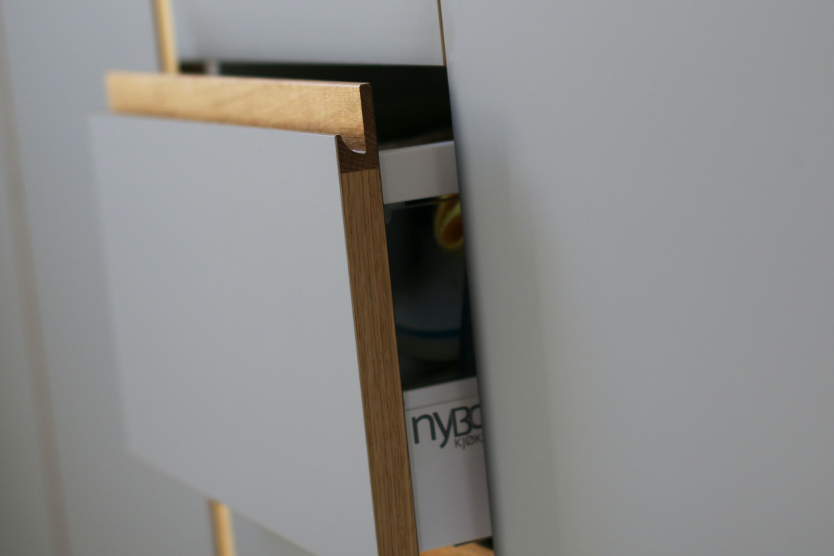 Slett og lekker front i høytrykkslaminat med integrerte grep i eik eller valnøtt.