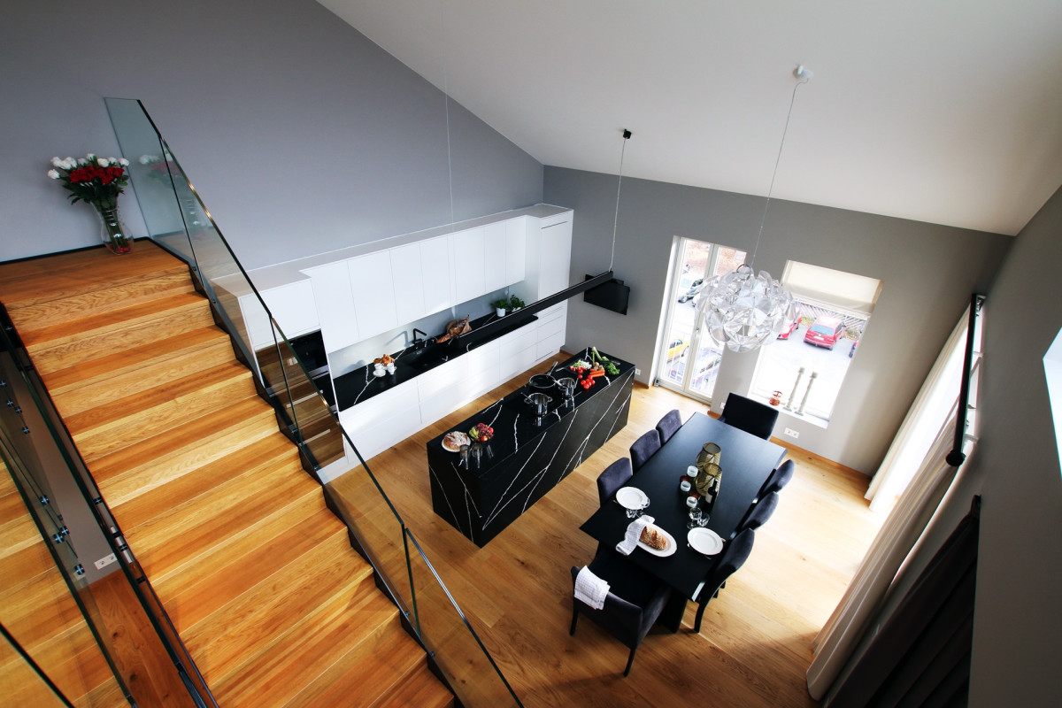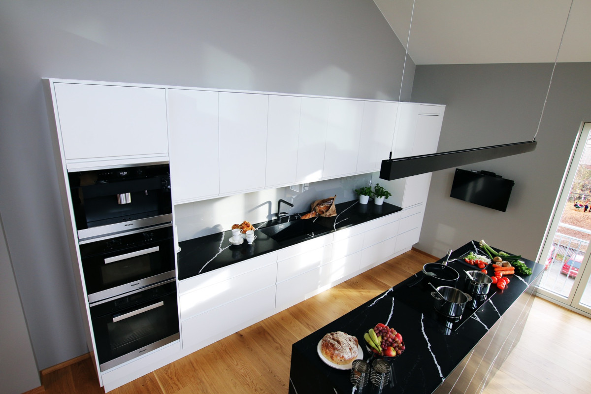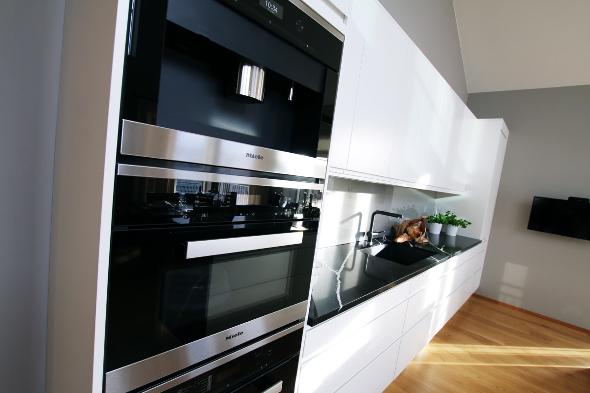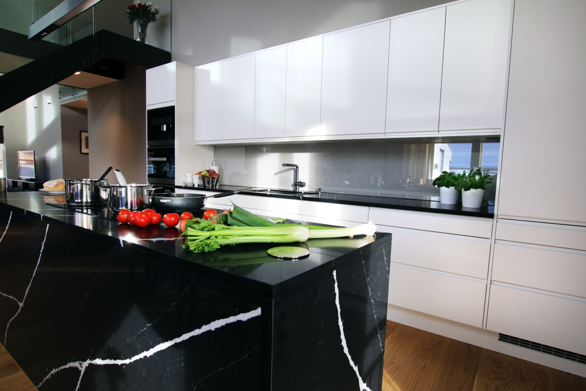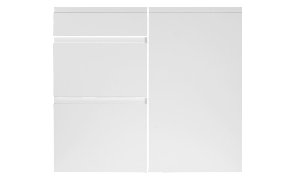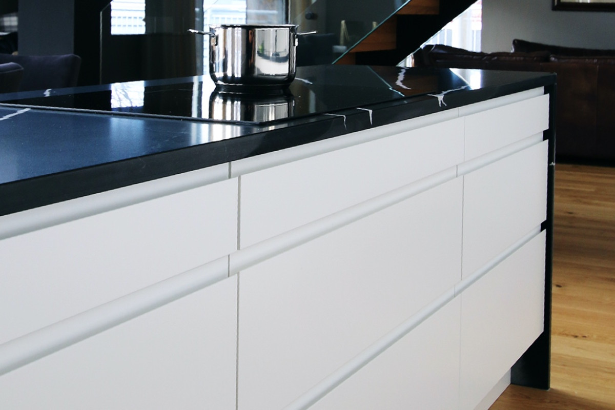En stilfull front med rene linjer, integrerte grep og matt overflate.